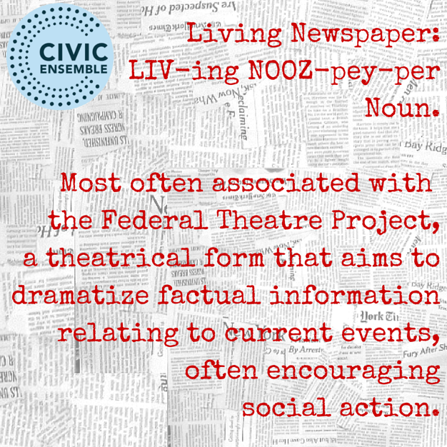 Originating in Russia and Germany at the turn of the 20th century, Living Newspapers are fact-based dramatizations of current events that gained prominence in the United States in the 1930s with the federally-funded Works Progress Administration (WPA), a cornerstone of President Roosevelt’s New Deal. The WPA employed millions of job seekers during the Great Depression, including infrastructure projects such as Ithaca’s Southside Community Center and Cascadilla Creek, and on arts and cultural initiatives.