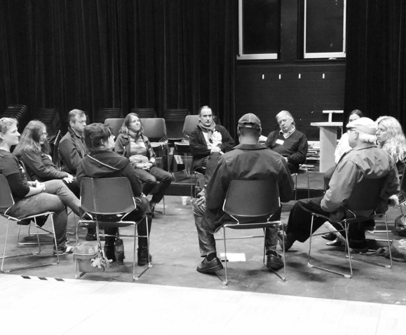 We facilitated post-show conversations after each performance. Sometimes these involved the people whose stories provided the inspiration for our scripts, the most memorable of which involved residents divided over the failed installation of a windfarm. Sometimes these involved community members discussing a specific topic, such as Ithaca’s plan for a Green New Deal, youth activists discussing the generational divide in styles of climate protests, and an evening with members of the local cell of Extinction Rebellion.